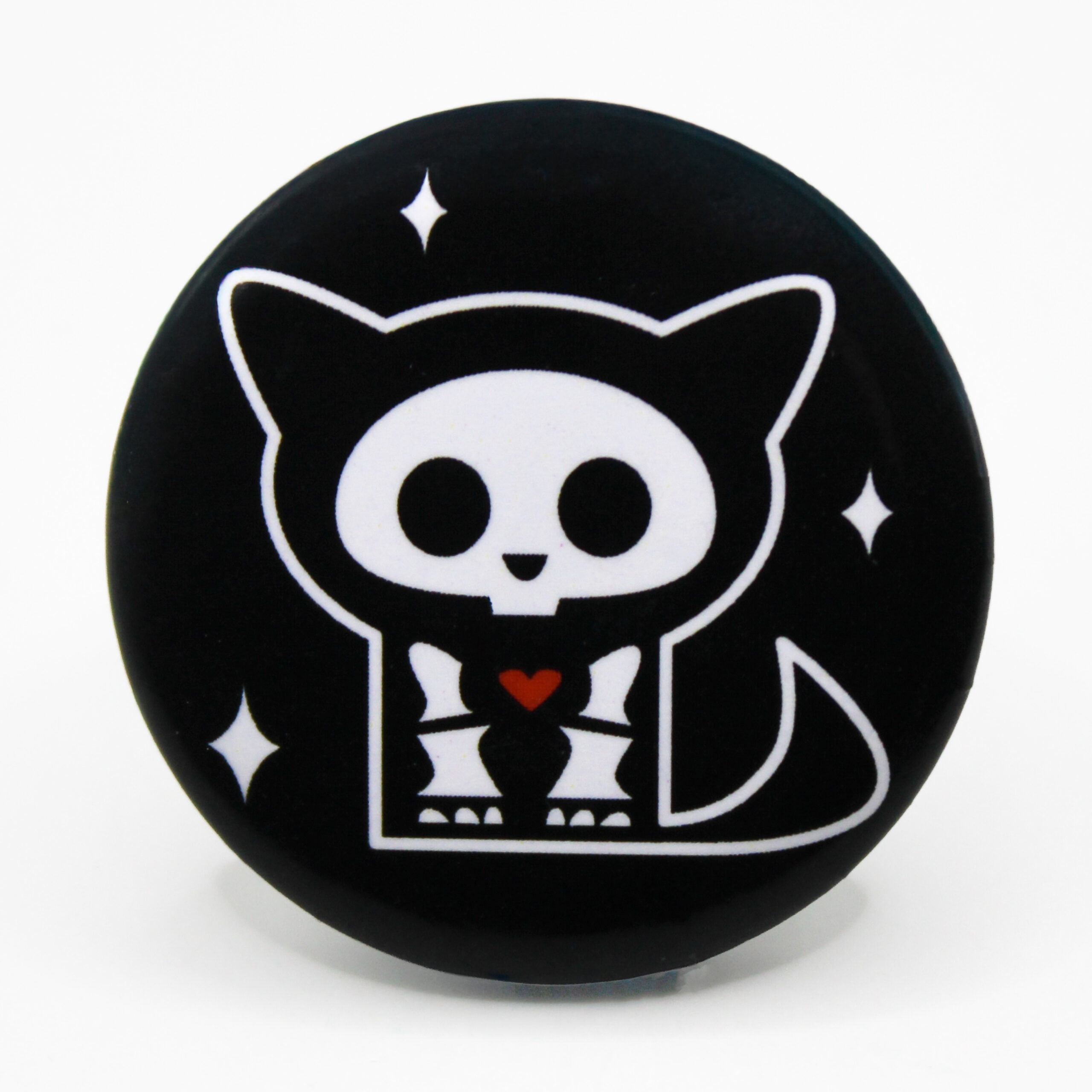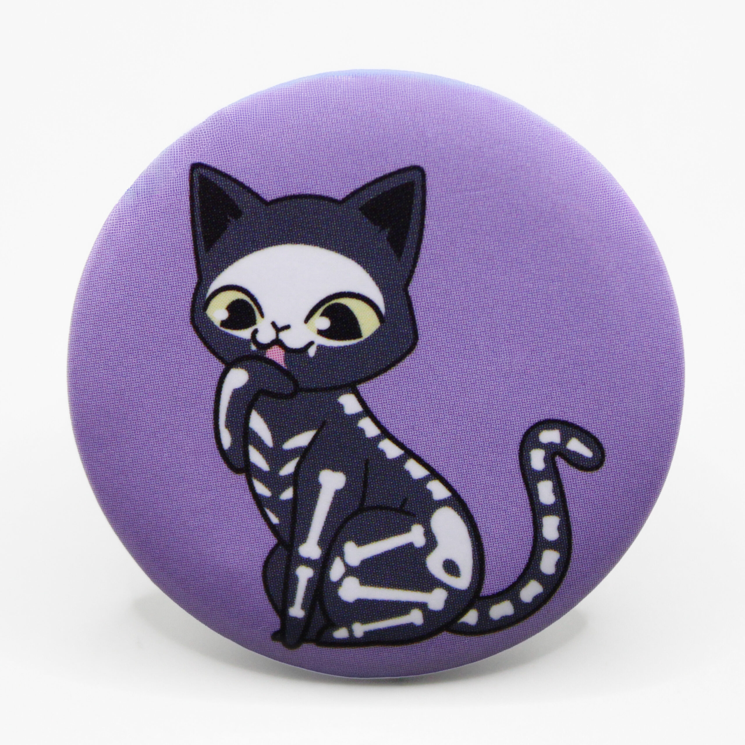 I like cats and Halloween. I got the black pin because that was the one I wanted in a mystery pin, but I didn’t end up getting it. I got the purple one because I just thought it was a really cute cat that was a skeleton. I like that the purple cat has bones in its tail, and I like that the black one has a heart. I got these pins from Hot Topic.